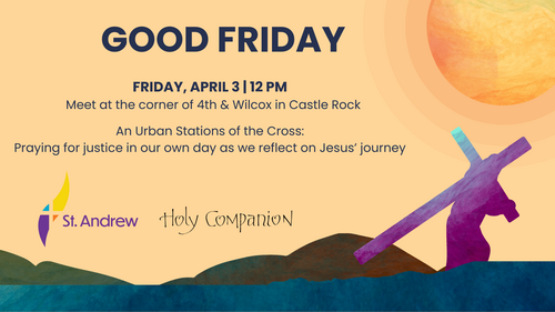 We are co-sponsoring a Stations of the Cross in Castle Rock to pray for justice in our county and community. Meet at noon at the corner of 4th and Wilcox in Castle Rock.