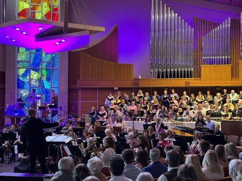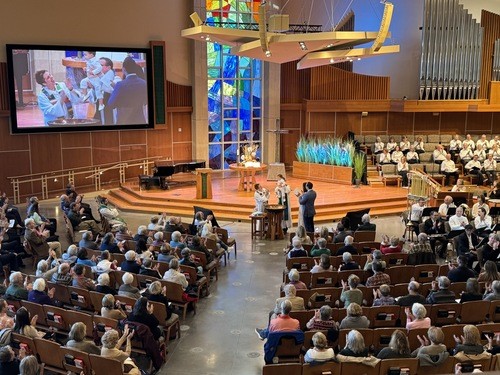 Sanctuary service featuring hymns, choir, orchestra, and more.