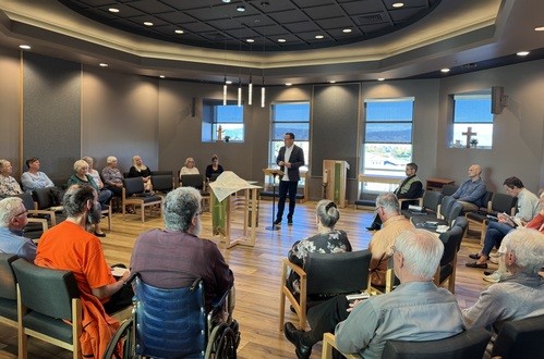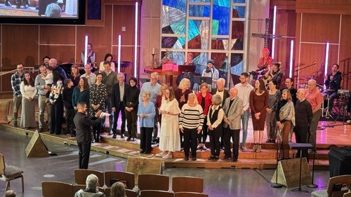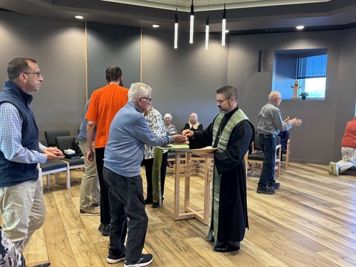 Intimate experience in our stained-glass chapel, featuring piano-accompanied hymns and small group setting.