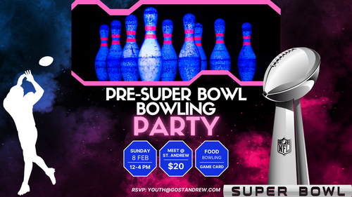 Meet at St. Andrew at noon on Sunday, and we'll bus to Main Event for bowling, laser tag, a pizza lunch, and games all before the big game! Pick up at St. Andrew at 4pm. $20 (scholarships available). All 6th-12th graders welcome!